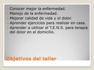 El documento proporciona información sobre la artrosis de rodilla y formas de autocuidado. Brevemente resume que la artrosis implica el desgaste del cartílago en las articulaciones, causando dolor y pérdida de movimiento. Ofrece recomendaciones sobre ejercicio, medicamentos, terapias y hábitos para mejorar la calidad de vida de quienes la padecen.