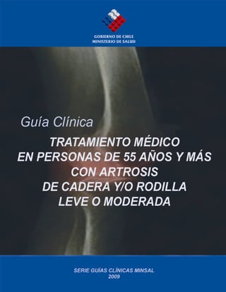 Este documento presenta una guía clínica sobre el tratamiento médico de personas mayores de 55 años con artrosis leve o moderada de cadera y/o rodilla. La artrosis es la enfermedad articular más frecuente y su prevalencia aumenta con la edad. La guía revisa la epidemiología, factores de riesgo, opciones de tratamiento farmacológico y no farmacológico, e incluye recomendaciones para el manejo de estos pacientes en el nivel primario de atención.