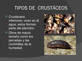 Los crustáceos tienen el cuerpo dividido en cefalotórax y abdomen, poseen un caparazón y se dividen en crustáceos inferiores como el plancton y mayores como los percebes, y crustáceos superiores que tienen el cefalotórax cubierto por un caparazón, dos ojos, dos pares de antenas, mandíbulas y cinco pares de patas. El documento también incluye un enlace a un video sobre crustáceos.