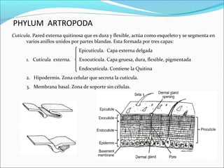 El documento describe las características de los artrópodos, incluyendo que tienen apéndices articulados, exoesqueleto quitinoso, simetría bilateral, y cuerpo segmentado transversalmente. Describe las características de los acaros e insectos, así como sus sistemas digestivo, respiratorio, circulatorio, nervioso y reproductor.