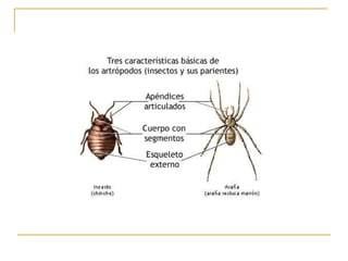 Los artrópodos son el filo animal más diverso, con cuerpos segmentados y apéndices articulados. Incluye insectos, arácnidos, miriápodos y crustáceos. Tienen exoesqueleto quitinoso, sistema nervioso dorsal y metamorfosis. Algunos son benéficos pero otros transmiten enfermedades o dañan cultivos.