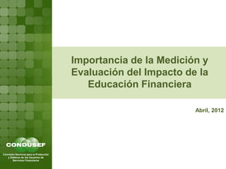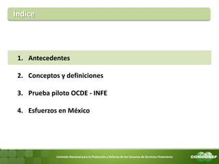 El documento de la Comisión Nacional para la Protección y Defensa de los Usuarios de Servicios Financieros destaca la importancia de medir y evaluar el impacto de la educación financiera en México, señalando la existencia de diversas iniciativas tanto públicas como privadas. Se abordan conceptos como alfabetización financiera, capacidades financieras y la metodología para evaluar conocimientos, comportamientos y actitudes relacionados con la gestión del dinero. Además, se presentan resultados preliminares de una prueba piloto internacional sobre niveles de alfabetización financiera en diferentes países.
