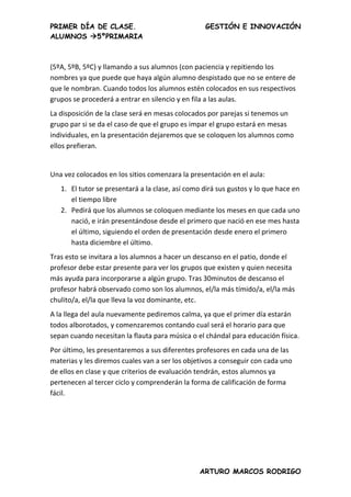 El documento describe el primer día de clase para los alumnos de 5o primaria. Se llevará a cabo una reunión con los padres antes del inicio del curso para presentar los objetivos, normas y materiales. En la presentación, los profesores llamarán a los alumnos por grupos y les mostrarán sus aulas. Después de un recreo, se presentarán los horarios, profesores y objetivos de cada asignatura.
