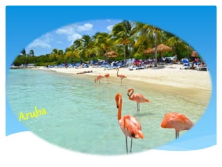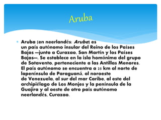 Aruba es una isla autónoma del Reino de los Países Bajos ubicada en el mar Caribe. Su economía depende principalmente del turismo, atraído por playas de arena blanca. El idioma oficial es el papiamento aunque también se habla neerlandés. El clima es tropical marítimo con temperaturas cálidas todo el año.