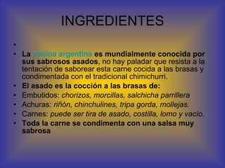 El documento describe la tradición del asado en la cocina argentina, incluyendo los ingredientes comunes como chorizos, morcillas y diferentes cortes de carne. Explica que la historia del asado se remonta a cuando se trajeron las primeras vacas a Argentina en 1556, y cómo los gauchos cazaban el ganado salvaje y asaban su lengua o caracúes. Más tarde, el gaucho empezó a comer la carne asada directamente, cavando un hoyo en la tierra para cocinar la carne parcialmente.