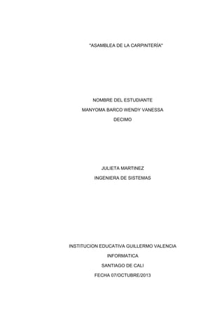 El documento presenta una fábula sobre una asamblea de herramientas de carpintería que se reúnen para resolver sus diferencias. Cada herramienta intenta echar la culpa a otra por sus defectos, hasta que el serrucho les recuerda que cada uno tiene cualidades valiosas. Al trabajar juntos bajo la dirección del carpintero, logran crear muebles de calidad. La historia sugiere que los seres humanos también deberían enfocarse en las cualidades de los demás en lugar de sus defectos para poder trabajar juntos de manera product