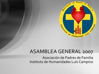 El documento describe la estructura organizativa y las actividades de la Asociación de Padres de Familia del Instituto de Humanidades Luís Campino durante el año 2007. La Asociación está compuesta por un Directorio que incluye una Presidenta, dos Vicepresidentes, una Secretaria, una Tesorera y varios directores encargados de áreas como eventos, deportes y pastoral. La Asociación ofrece becas a estudiantes, organiza eventos como un té solidario y bingo para recaudar fondos, y apoya financieramente diversas actividades del colegio a lo largo