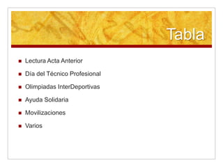 El documento resume las actividades planeadas para el Día del Técnico Profesional en el Liceo, incluyendo charlas, ceremonias y una fiesta. También detalla las olimpiadas interdeportivas, una caja de mercadería que cada curso debe aportar, y varias invitaciones a eventos culturales.