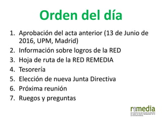 Este documento resume la orden del día y los logros de la Asociación RED REMEDIA. La orden del día incluye la aprobación del acta anterior, información sobre los logros de la red, la hoja de ruta futura, la tesorería, la elección de una nueva junta directiva y la próxima reunión. Entre los logros se destacan la publicación de números especiales en revistas, proyectos de investigación y transferencia, y el crecimiento de la red a aproximadamente 400-500 personas de diversas disciplinas y regiones geográficas.
