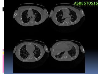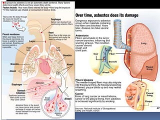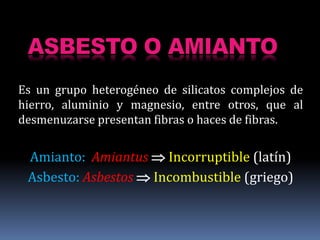 Este documento resume una presentación sobre salud ocupacional y ambiental realizada en la Universidad Mayor de San Andrés en Bolivia en 2012. La presentación cubre temas como la exposición al asbesto en entornos laborales y ambientales, las propiedades físicas y químicas del asbesto, los efectos en la salud como la asbestosis y el mesotelioma, así como medidas de prevención para reducir la exposición al asbesto.