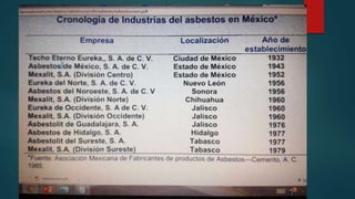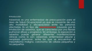 Este documento describe la asbestosis, una enfermedad pulmonar causada por la inhalación de asbesto que causa fibrosis pulmonar. Explica que México importa asbesto de otros países y que a pesar de ser cancerígeno, no existen programas de prevención adecuados para los trabajadores expuestos. Finalmente, detalla las manifestaciones clínicas y las medidas de prevención como el control de polvo en la fuente y la ventilación adecuada.