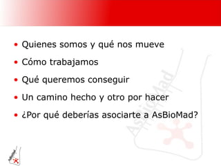 Asbiomad es una asociación sin ánimo de lucro en Madrid que promueve la biotecnología y apoya a profesionales, investigadores y estudiantes del sector. La entidad busca fomentar redes profesionales, colaborar con instituciones y acercar la ciencia a la sociedad, ofreciendo además una bolsa de empleo específica. Asociarse brinda acceso a información, formación continua y oportunidades de conexión a nivel nacional y europeo.