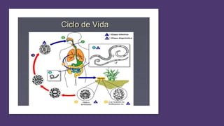 La ascariasis es una infección causada por el parásito Ascaris lumbricoides. Los síntomas incluyen tos con expulsión de lombrices, pérdida de apetito y fiebre. El diagnóstico se realiza mediante la identificación de huevos característicos en las heces. El tratamiento incluye medicamentos antihelmínticos como albendazol o mebendazol. La ascariasis es una de las parasitosis más comunes en el mundo, especialmente entre los niños.
