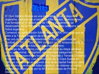 El documento presenta información sobre varios clubes de fútbol de Argentina que participan en las divisiones inferiores del fútbol argentino, incluyendo su fecha de fundación, colores representativos, logros deportivos y estadios. Entre los clubes descritos se encuentran Atlanta, Platense, Nueva Chicago, Estudiantes de Buenos Aires, Defensores de Belgrano, Morón, Barracas Central, Villa San Carlos, Brown, Armenio y otros.