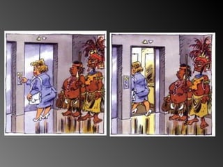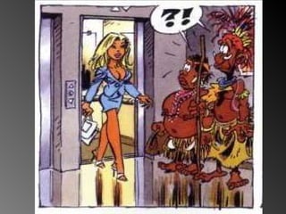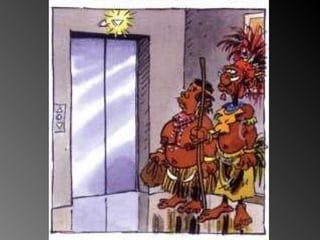 Una pareja de Melanesia viaja por primera vez en avión y visita un edificio moderno. El documento describe su primera experiencia con un ascensor, del cual no conocen su función, y la amabilidad del personal al guiarlos en su nuevo entorno.
