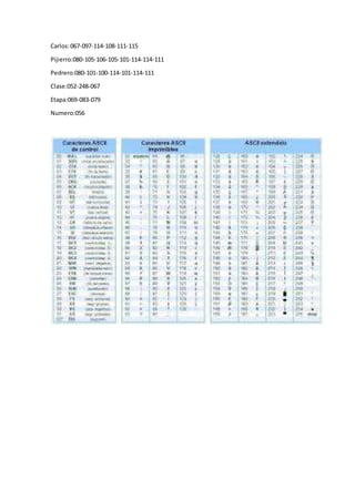 El documento contiene una lista de nombres (Carlos, Pijierro, Pedrero), una clase (052-248-067), una etapa (069-083-079) y un número (056), presumiblemente de un estudiante.