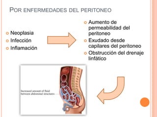 El documento describe la ascitis, que es la acumulación de líquido en la cavidad peritoneal. La causa más común de ascitis es la hipertensión portal, que ocurre en el 80% de los casos de cirrosis hepática. La fisiopatología involucra un aumento de la presión hidrostática en los senos venosos hepáticos que filtra líquido al espacio intersticial. Otras causas de ascitis incluyen enfermedades del peritoneo que aumentan la permeabilidad de los capilares peritoneales o obstruyen el dren