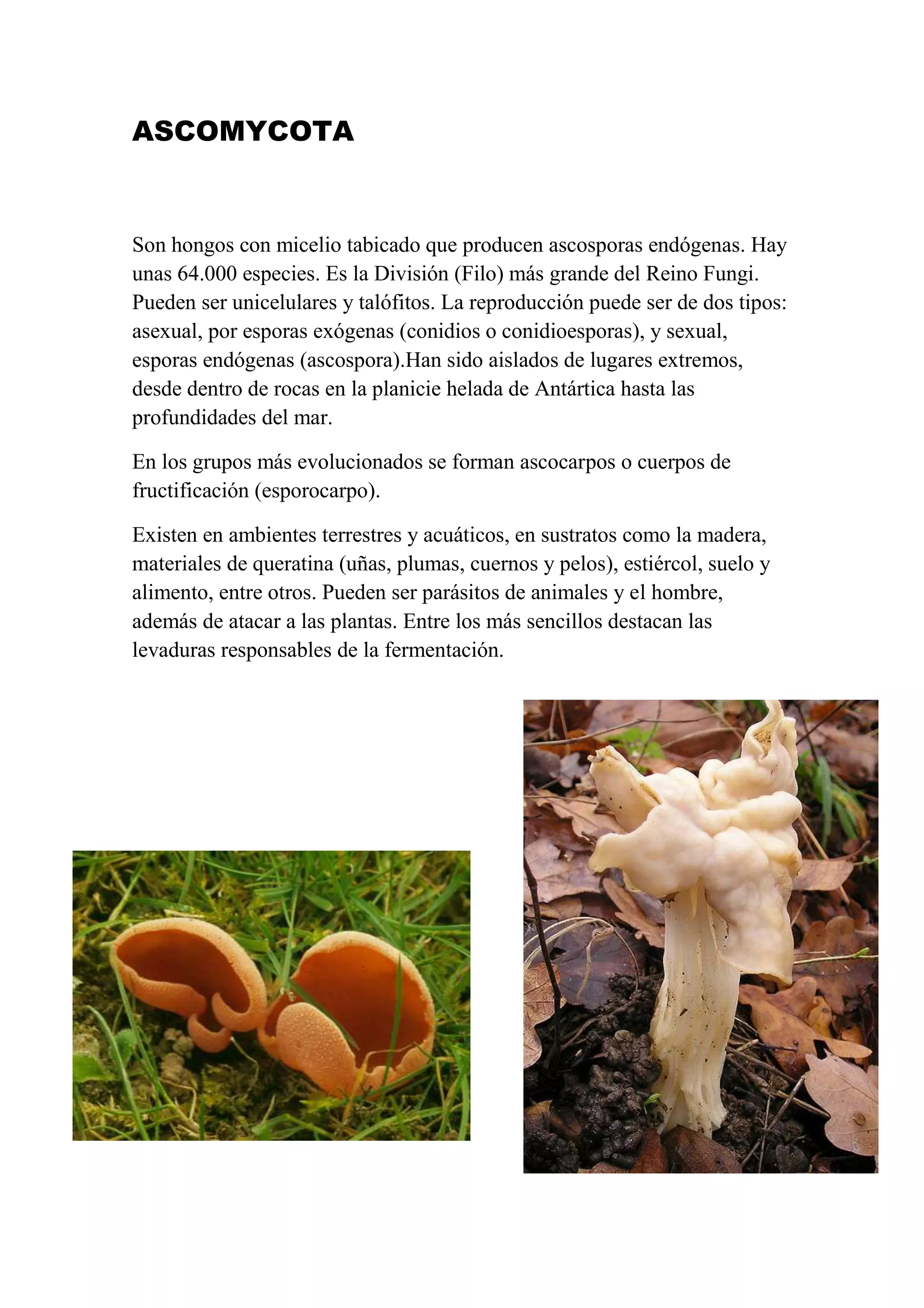 Las ascomicotas son hongos con micelio tabicado que producen ascosporas endógenas. Existen en ambientes terrestres y acuáticos, y pueden reproducirse de forma asexual a través de esporas exógenas o de forma sexual a través de ascosporas endógenas. Las ascomicotas incluyen alrededor de 64,000 especies y son la división más grande del reino Fungi.