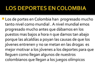El documento resume los progresos de Colombia en los deportes a nivel mundial y nacional, y argumenta que el apoyo de las alcaldías a los jóvenes en los deportes en lugar de las drogas es positivo. Presenta algunos deportistas colombianos exitosos como Mariana Pujón, Eider Orlando Arevalo, Tatiana Ariza Díaz y Carlos Andrés Berna, y enlaces a sitios web sobre deportes olímpicos y deportistas colombianos.