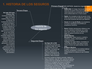Este documento proporciona una historia general de los seguros a través de las edades, desde la antigüedad hasta la actualidad. Explica los orígenes de los seguros en Babilonia, Egipto, Grecia y Roma, su desarrollo en la Edad Media y su afianzamiento como instituciones técnicas y jurídicas modernas desde el siglo XVI hasta nuestros días. También describe los diferentes tipos de seguros para personas, bienes y empresas.