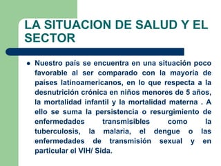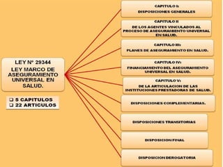 Este documento describe la situación de salud en Perú y la necesidad de un sistema de aseguramiento universal en salud. Actualmente, el acceso a los servicios de salud en Perú es limitado y la salud pública es deficiente, lo que ha dado lugar a altas tasas de desnutrición infantil, mortalidad materna e infantil. El documento argumenta que un sistema de aseguramiento universal mejoraría el acceso a la atención médica y protegería a las familias de los costos médicos catastróficos. Explica que la ley peru