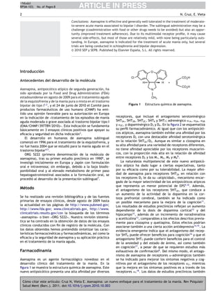 Este documento resume la evidencia sobre la eficacia y seguridad de la asenapina, un nuevo antipsicótico atípico, en el tratamiento de la manía aguda. La asenapina tiene una acción multireceptorial y debe administrarse de forma sublingual. Estudios clínicos muestran que la asenapina es eficaz y generalmente bien tolerada para el tratamiento de la manía aguda moderada o grave asociada al trastorno bipolar tipo I. Su perfil de efectos adversos es relativamente leve, sin efectos secund