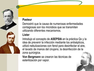 El documento describe los conceptos de asepsia y antisepsia. La asepsia se refiere a los procedimientos para prevenir la llegada de microorganismos, mientras que la antisepsia se refiere a los procedimientos para destruir microorganismos patógenos mediante el uso de antisépticos y desinfectantes. También define varios términos relacionados como antiséptico, desinfectante, esterilización, entre otros. Explica los principales desinfectantes químicos utilizados y las consideraciones en el dise