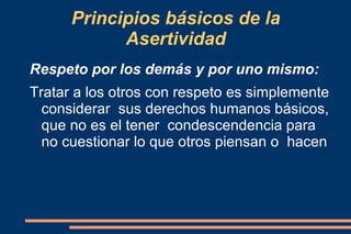 El comportamiento asertivo permite expresar lo que se piensa y siente sin ofender a los demás, abriendo el diálogo. Los principios básicos incluyen respetar a los demás y a uno mismo, ser directo y honesto. Las personas tienen derechos como considerar sus propias necesidades, cambiar de opinión, cometer errores y pedir lo que necesitan siempre que no se violen los derechos de los demás.