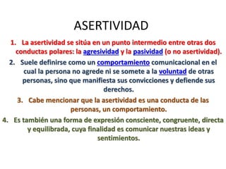 El documento describe conceptos de personalidad y comunicación. Define la asertividad como un punto intermedio entre la agresividad y la pasividad, donde una persona expresa sus convicciones sin someterse a otros. También describe la proactividad como una actitud de asumir el control de la propia conducta mediante la toma de iniciativas creativas y audaces para generar mejoras. Finalmente, caracteriza a las personas reactivas por mostrar poca disposición a actuar, posponer compromisos y decisiones, soñar en lugar de querer, y no concretar ideas deb