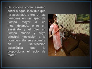 El documento describe las características de los asesinos seriales, incluyendo que deben haber asesinado a 3 o más personas en un período de tiempo mayor a un mes y que su motivación principal es la satisfacción psicológica. Además, señala que muchos asesinos seriales fueron víctimas de abuso durante su infancia y menciona tres señales de advertencia: piromanía, crueldad hacia animales e incontinencia urinaria. Finalmente, resume las historias de varios asesinos seriales notorios.