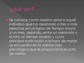El documento describe diferentes tipos de asesinos seriales, incluyendo asesinos organizados que planifican meticulosamente sus crímenes, ángeles de la muerte que matan a personas bajo su cuidado, y viudas negras que matan por intereses económicos o celos. También señala que la mayoría de asesinos seriales fueron víctimas de abuso durante su infancia y desarrollaron fantasías de asesinato desde una edad temprana.