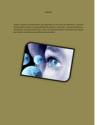 La empresa Asesoría Documental busca obtener el 60% del mercado municipal para 2022 brindando asesoría y capacitación en organización y conservación de archivos. El grupo de profesionales ofrece servicios como asesorías en organización documental, capacitaciones al personal de archivo, y diagnósticos archivísticos para ayudar a las empresas a mantener documentos en buen estado.