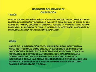 El documento describe el proyecto del servicio de orientación de un colegio. Su misión es apoyar el desarrollo de los estudiantes mediante programas de orientación vocacional, asesoría académica, educación sexual y servicios sociales. El proyecto busca mejorar la convivencia escolar, el rendimiento académico y la toma de decisiones de los estudiantes con el apoyo de entidades externas.