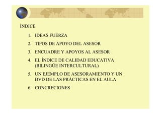 Este documento describe el asesoramiento técnico pedagógico para escuelas en Cobán, Guatemala. Explica que el cambio educativo requiere voluntad, compromiso y conocimiento, y que el asesoramiento es un catalizador para desarrollar una cultura de reflexión y mejora continua. También describe los tipos de apoyo que los asesores brindan a las escuelas y localidades, así como el índice de calidad educativa que usan para diagnosticar y planificar mejoras. Concluye enfatizando que el cambio sustancial requi