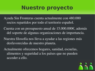 La organización Ayuda Sin Fronteras cuenta con 480.000 socios en España y un presupuesto anual de 15 millones de euros. Su filosofía es ayudar a las regiones más desfavorecidas del mundo ofreciendo hogares, sanidad, escuelas, alimentos y seguridad a países que no pueden acceder a ello. Más de 1.200 millones de personas en el mundo no pueden acceder a bienes básicos para subsistir y más de la mitad tampoco tiene acceso a educación y sanidad.
