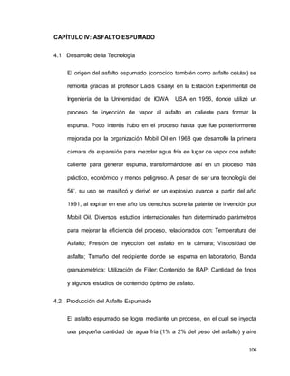El documento describe la historia y proceso de producción del asfalto espumado. Se originó en 1956 y se ha mejorado desde entonces. Se produce mediante la inyección de agua fría y aire comprimido en asfalto caliente, lo que genera espuma. Las burbujas de vapor forman gotas de asfalto que se adhieren a los agregados finos para formar una mezcla. La calidad se mide por la expansión y vida media de la espuma.