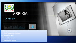 Este documento trata sobre asfixia y ahorcamiento. Define asfixia como la falta de oxígeno en el cuerpo y clasifica los tipos de asfixia. Describe los mecanismos y características del ahorcamiento, incluyendo la posición del nudo, signos externos y causas como suicidio, accidente u homicidio. Explica las diferencias entre ahorcamiento y estrangulamiento.