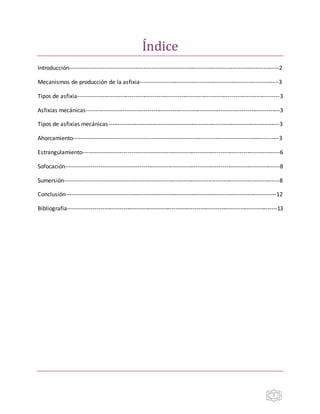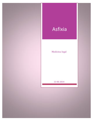 Este documento describe los diferentes tipos de asfixia desde una perspectiva médico-legal. Explica las asfixias mecánicas como el ahorcamiento, estrangulamiento, sofocación y sumersión. También cubre los mecanismos de producción de la asfixia, tipos (externa e interna), y signos internos y externos que pueden observarse en una autopsia para determinar la causa de muerte.