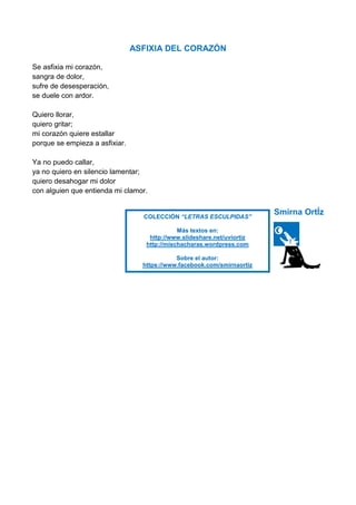 El texto expresa un profundo dolor emocional y la sensación de asfixia del corazón, deseando liberar sus sentimientos a alguien que comprenda su sufrimiento. La autora, Smirna Ortíz, invita a desahogar el dolor en lugar de guardarlo en silencio. Se menciona que forma parte de la colección 'letras esculpidas' y se proporcionan enlaces para más textos y sobre el autor.