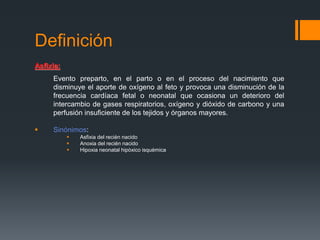 Este documento describe la asfixia perinatal, incluyendo sus definiciones, factores de riesgo, etiología, patogénesis y manifestaciones clínicas. La asfixia perinatal causa daño multiorgánico, afectando principalmente el SNC, riñones, pulmones y corazón. Las manifestaciones clínicas incluyen encefalopatía hipóxico-isquémica, insuficiencia renal, miocardiopatía e hipertensión pulmonar del recién nacido. El grado de compromiso neurológ