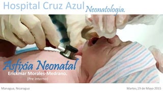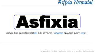 Este documento trata sobre la asfixia neonatal. Define la asfixia como la suspensión o grave disminución del intercambio gaseoso a nivel de la placenta o de los pulmones. Describe las manifestaciones clínicas, exámenes de laboratorio y gabinete necesarios, y el tratamiento para la asfixia neonatal, incluyendo la reanimación inmediata y el mantenimiento de parámetros vitales. También cubre las complicaciones y los indicadores de mal pronóstico como la encefalomalacia.