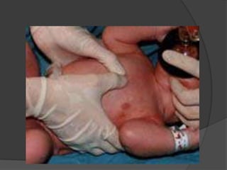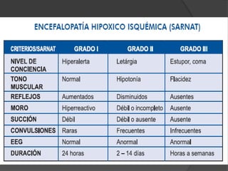 Este documento describe la asfixia neonatal, una de las principales causas de muerte neonatal en el Perú. La asfixia neonatal se produce cuando el recién nacido no recibe suficiente oxígeno antes, durante o después del parto y puede causar daño cerebral, problemas respiratorios, metabólicos y de otros órganos. El documento explica los factores de riesgo, signos y síntomas, tratamiento de emergencia incluyendo reanimación cardiopulmonar, y posibles complicaciones a largo plazo como discapacidad neurológica.