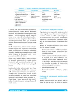 Este documento describe la asfixia neonatal, incluyendo su definición, incidencia, fisiopatología, manifestaciones clínicas y tratamiento. La asfixia neonatal ocurre cuando hay falta de oxígeno o flujo sanguíneo al feto y puede causar daño cerebral, cardiaco, renal y otros órganos. El tratamiento se enfoca en mantener niveles adecuados de oxígeno y presión arterial para optimizar la perfusión sin causar reperfusión. La prevención incluye monitoreo fetal y cesárea de urgencia cuando hay