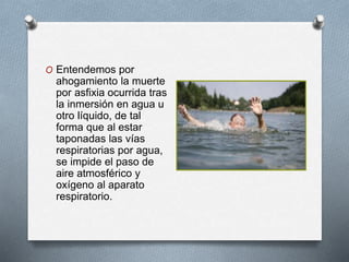 El documento describe los tipos de ahogamiento por sumersión en agua dulce y salada. El ahogamiento por agua dulce ocurre cuando el agua entra en los pulmones e hincha las células, mientras que el agua salada es hipertónica y hace que el agua entre en los pulmones. Ambos tipos de agua causan daño en los alvéolos pulmonares. Los primeros auxilios incluyen verificar la respiración de la víctima, no hacerles vomitar y pedir ayuda médica de emergencia.
