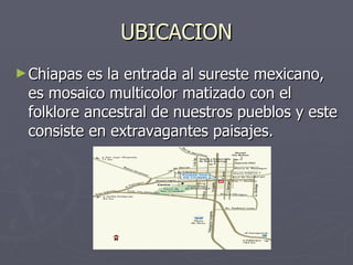 Chiapas se encuentra en el sureste de México y se caracteriza por su diversidad cultural y paisajes variados. El traje regional de Chiapas consiste en faldas bordadas a mano con flores de seda. Una bebida tradicional es el pozol, que se hace moliendo y batiendo maíz en agua. La Catedral de San Marcos en Tuxtla Gutiérrez rinde culto a San Marcos, quien introdujo el cristianismo a los indígenas. El Cañón del Sumidero ofrece vistas de estratos geol