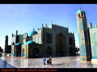 Este documento presenta lugares y aspectos culturales destacados de varios países y regiones de Asia, Medio Oriente, África y Europa, incluyendo sitios patrimoniales como mezquitas, templos y monumentos; paisajes naturales como desiertos, montañas y ríos; y tradiciones como festivales y estilos de vida nómadas.