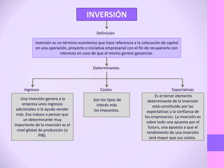 Este documento define la inversión pública y privada, y describe los componentes y funciones del Sistema Nacional de Inversión Pública de un país. La inversión pública se refiere a la utilización de fondos recaudados en impuestos por el gobierno para reinvertirlos en proyectos que benefician a la población, mientras que la privada busca obtener ganancias económicas. El Sistema Nacional de Inversión Pública coordina el proceso de inversión pública para seleccionar los proyectos más rentables y alineados