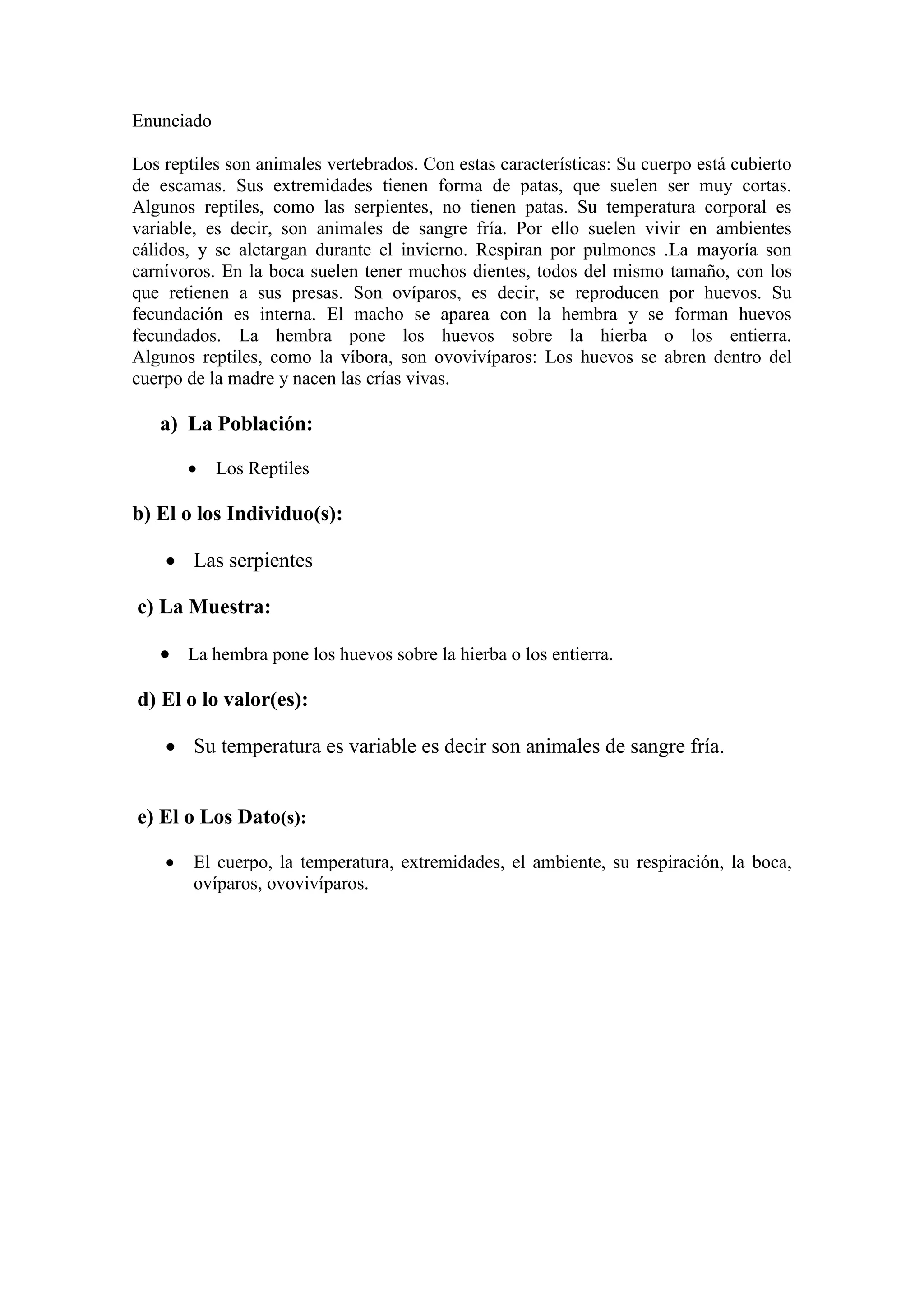Los reptiles son animales vertebrados cubiertos de escamas, con extremidades en forma de patas cortas o sin patas. Tienen sangre fría y respiran por pulmones, la mayoría son carnívoros con dientes para retener presas. Se reproducen por huevos ovíparos o crías vivas ovovivíparas, con la hembra poniendo los huevos en la hierba o enterrándolos.