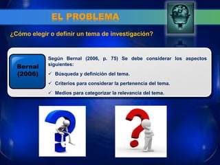 El documento aborda cómo plantear la problemática en una tesis doctoral, enfatizando la importancia de seleccionar un tema de investigación relevante y pertinente, basado en criterios como la novedad y factibilidad. Se indican las diversas fuentes de donde puede surgir un tema, incluyendo la lectura crítica, la experiencia personal y la práctica profesional. Además, se describe la función del marco teórico como base de soporte que guía la investigación y ayuda a evitar errores previos, interpretando los resultados y estableciendo hipótesis.