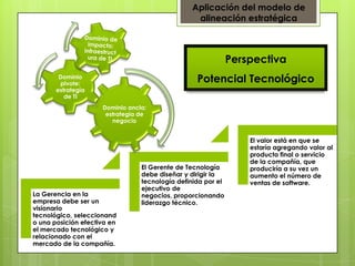 El documento describe el modelo de alineación estratégica entre la estrategia de TI y la estrategia de negocio de una empresa. La estrategia de TI debe estar alineada y apoyar la estrategia de negocio definida por la gerencia. El gerente de TI debe diseñar y dirigir la tecnología requerida para ejecutar la estrategia de negocio y proveer liderazgo técnico.
